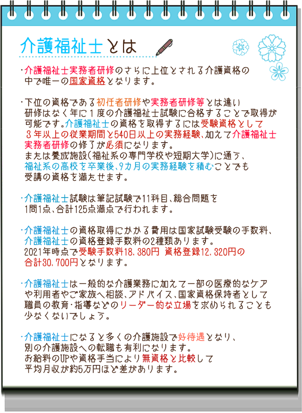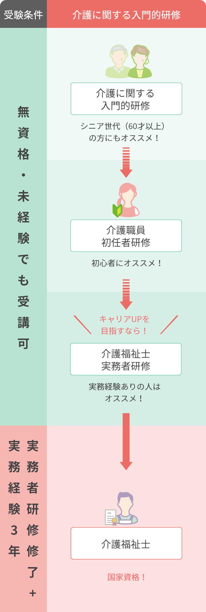 介護業界では、実務経験の内容や年数によって、努力次第で着実にキャリアアップできる資格制度が整っています。