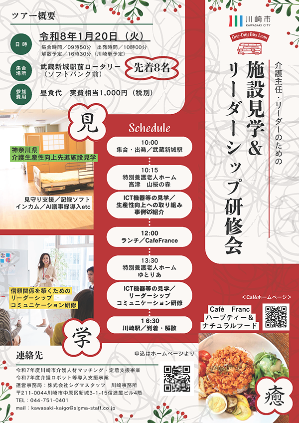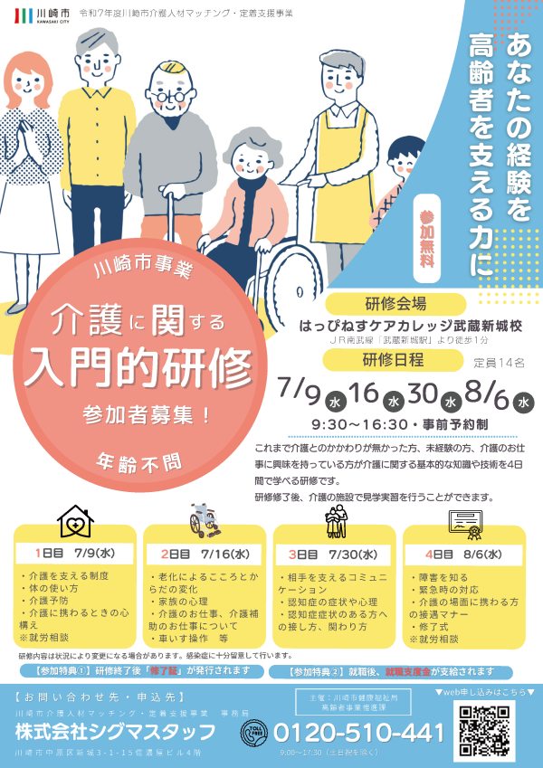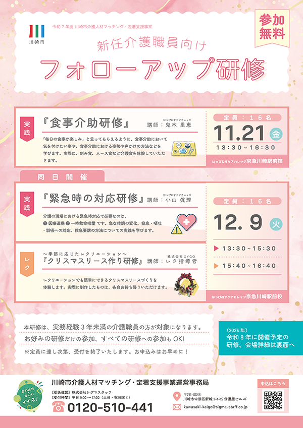 川崎市内の介護人材確保と定着に関する事業を市より受託し運営を行っております。初めて介護・福祉業界でお仕事をする方の資格取得と就労を中心に、現介護職員のスキルアップの研修、ステップアップの研修・派遣などサポートしております。求職者様の不安やお困りごとに寄り添い、ご希望に合わせてバックアップさせていただきます。事業所様の人材育成・確保だけでなくより良い職場環境づくり等の支援もさせていただきます。求職者と事業所の架け橋となり、双方のサポートに努めて参ります。