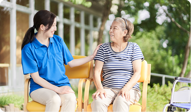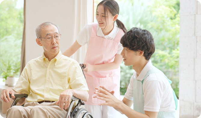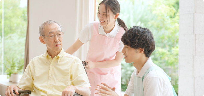 「介護」とは、一方的なお世話ではなく、生きる希望や喜びをもって日々生きることを支える、 対人サービスのプロフェッショナルです。しかも介護の仕事は、『景気に左右されず』『自宅の近くで』『働き方を選んで』『長く安定して』働くことができる、魅力いっぱいの職業なんです!